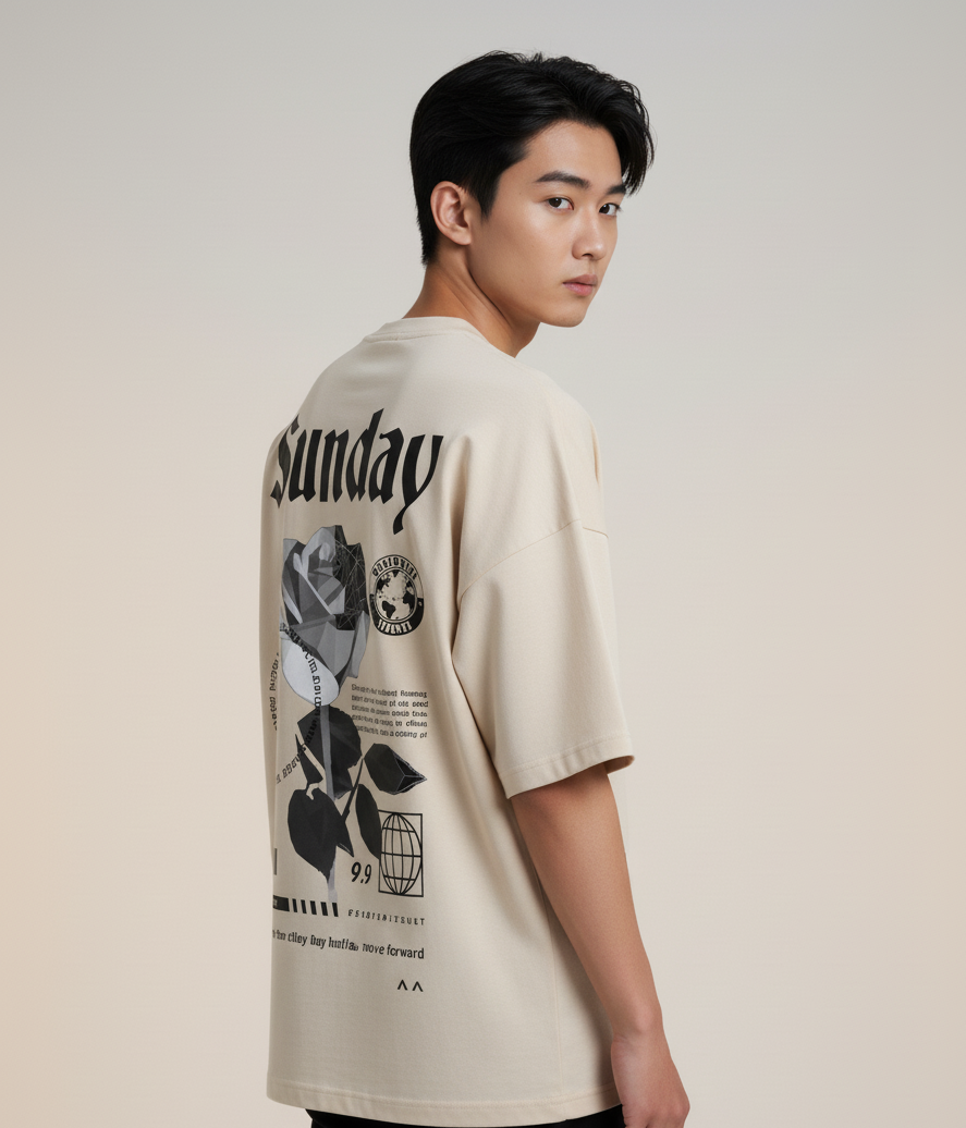 Elevate your everyday style with this premium oversized beige graphic tee, featuring a clean and classy Golden Clasp print on the front and a bold Sunday Rose artwork on the back. Designed for comfort and aesthetics, this T-shirt blends minimalism with streetwear energy, making it perfect for both casual outings and statement looks.
