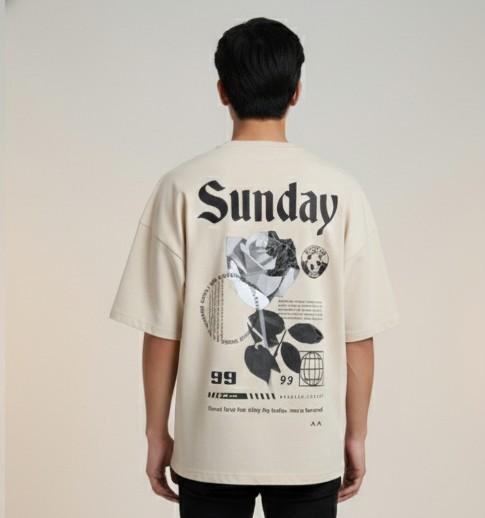 Beige oversized streetwear T-shirt with Golden Clasp front print and a bold Sunday Rose graphic on the back. Comfortable, stylish, and perfect for everyday wear.
