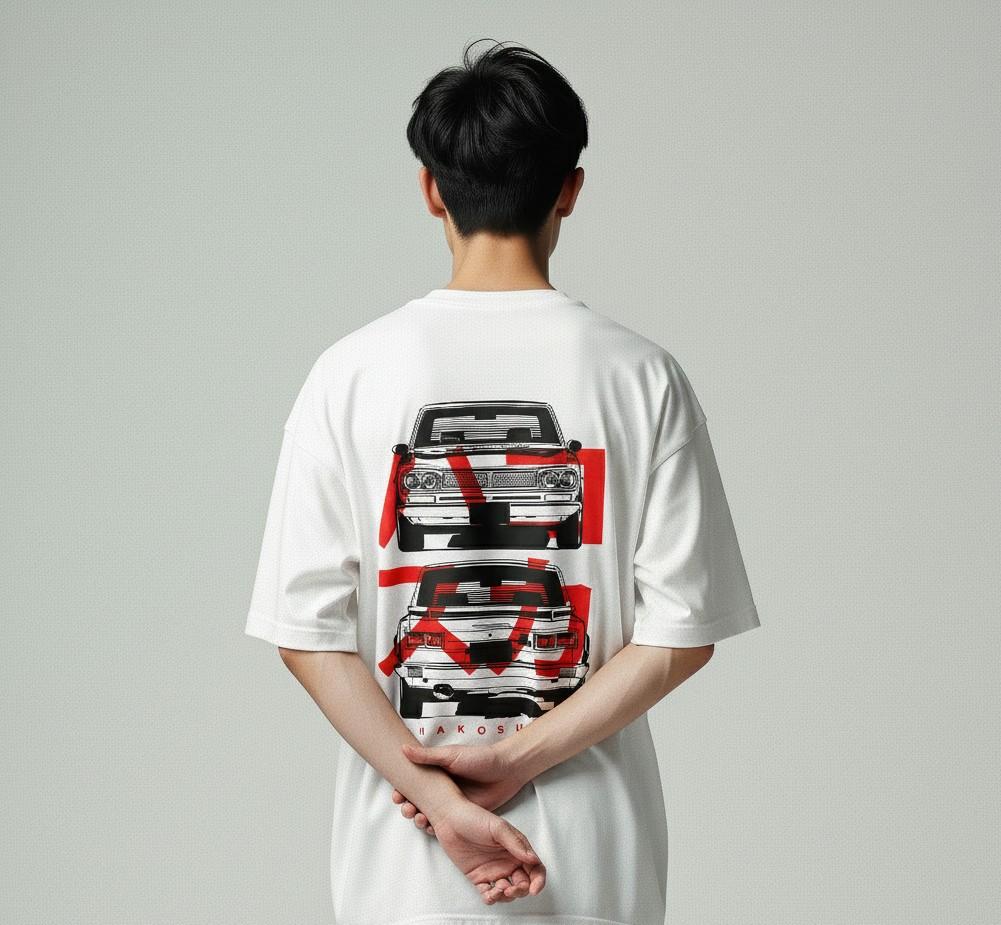 Oversized white JDM T-shirt featuring a minimal Hakosuka front print and a detailed retro Skyline graphic on the back. Premium cotton and perfect for streetwear and car enthusiasts.